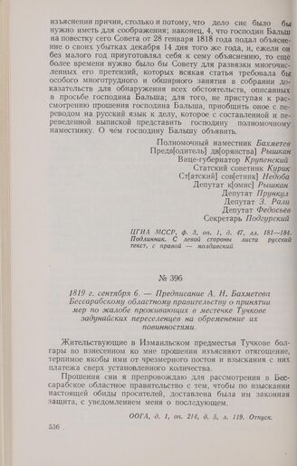 1819 г. сентября 6. — Предписание А. Н. Бахметева Бессарабскому областному правительству о принятии мер по жалобе проживающих в местечке Тучкове задунайских переселенцев на обременение их повинностями // ООГА, д. 1, оп. 214, д. 5, л. 119. Отпуск.
