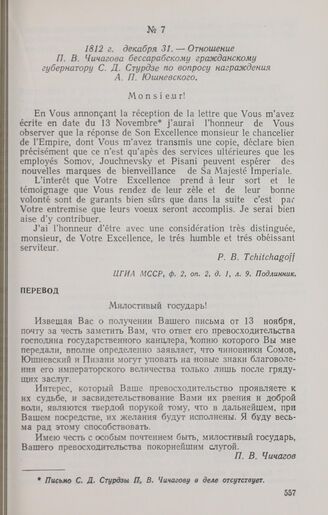 1812 г. декабря 31. — Отношение П. В. Чичагова бессарабскому гражданскому губернатору С. Д. Стурдзе по вопросу награждения А. П. Юшневского // ЦГИА МССР, ф. 2, оп. 2, д. 1, л. 9. Подлинник.