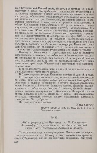 1816 г. февраля 1. — Прошение А. П. Юшневского Александру I о причислении его по дипломатической части в штат главнокомандующего II армией // ЦГВИА СССР, ф. МА, оп. 184а, св. 3, д. 6, лл. 1—3. Копия.