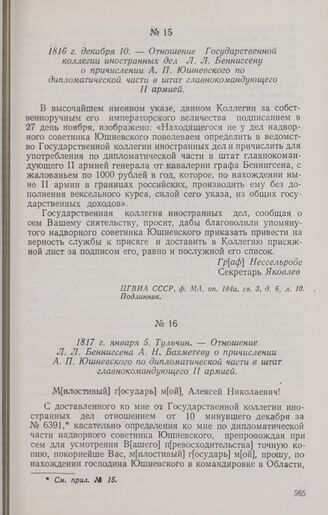 1816 г. декабря 10. — Отношение Государственной коллегии иностранных дел Л. Л. Беннигсену о причислении А. П. Юшневского по дипломатической части в штат главнокомандующего II армией