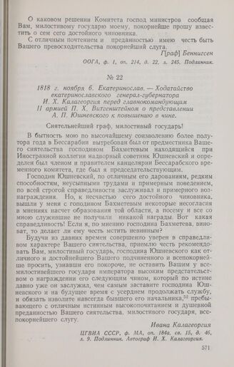 1818 г. ноября 6. Екатеринослав. — Ходатайство екатеринославского генерал-губернатора И. X. Калагеоргия перед главнокомандующим II армией П. X. Витгенштейном о представлении А. П. Юшневского к повышению в чине // ЦГВИА СССР, ф. МА, оп. 184а, св. 15, д. 46, л. 9. Подлинник. Автограф И. X. Калагеоргия.