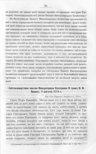 Бумаги графа Петра Ивановича Панина о пугачевском бунте. Собственноручное письмо Императрицы Екатерины II графу П.И. Панину, 8 августа 1774 г. Из Села Царского