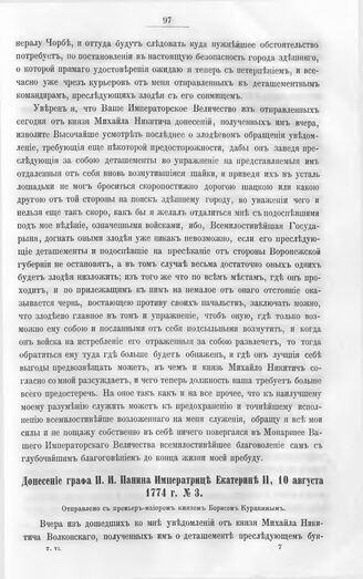 Бумаги графа Петра Ивановича Панина о пугачевском бунте. Донесение графа П.И. Панина Императрице Екатерине II, 10 августа 1774 г. № 3