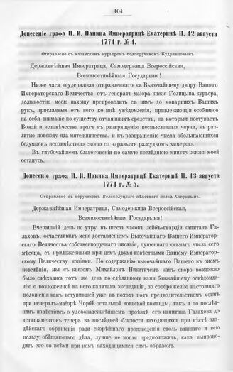 Бумаги графа Петра Ивановича Панина о пугачевском бунте. Донесение графа П.И. Панина Императрице Екатерине II, 12 августа 1774 г. № 4