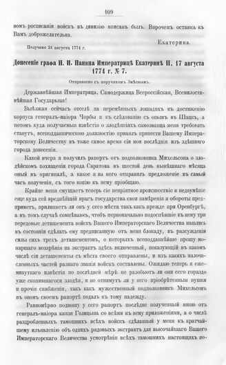 Бумаги графа Петра Ивановича Панина о пугачевском бунте. Донесение графа П.И. Панина Императрице Екатерине II, 17 августа 1774 г. № 7