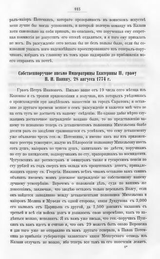 Бумаги графа Петра Ивановича Панина о пугачевском бунте. Собственноручное письмо Императрицы Екатерины II графу П.И. Панину, 28 августа 1774 г. Из Петербурга