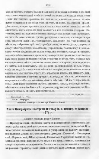 Бумаги графа Петра Ивановича Панина о пугачевском бунте. Указ Императрицы Екатерины II графу П.И. Панину, 2 сентября 1774 г. Из С. Петербурга
