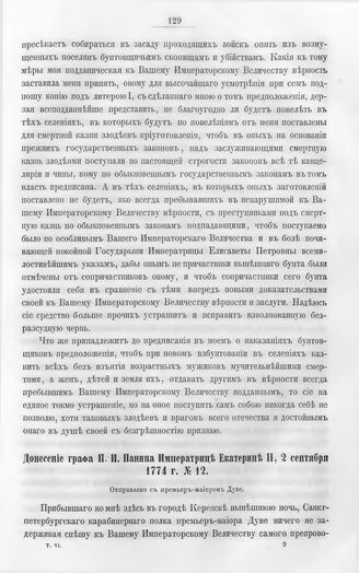 Бумаги графа Петра Ивановича Панина о пугачевском бунте. Донесение графа П.И. Панина Императрице Екатерине II, 2 сентября 1774 г. № 12