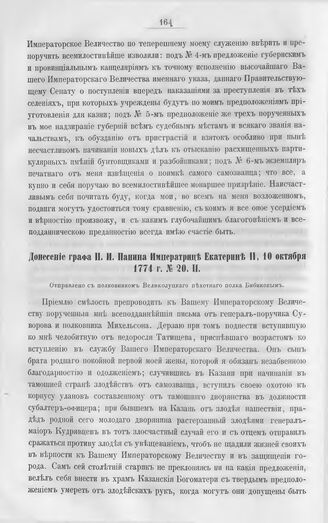 Бумаги графа Петра Ивановича Панина о пугачевском бунте. Донесение графа П.И. Панина Императрице Екатерине II, 10 октября 1774 г. № 20.II