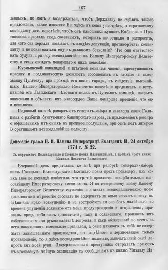 Бумаги графа Петра Ивановича Панина о пугачевском бунте. Донесение графа П.И. Панина Императрице Екатерине II, 24 октября 1774 г. № 22
