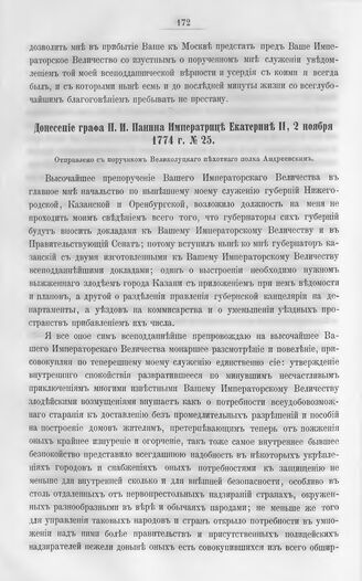 Бумаги графа Петра Ивановича Панина о пугачевском бунте. Донесение графа П.И. Панина Императрице Екатерине II, 2 ноября 1774 г. № 25