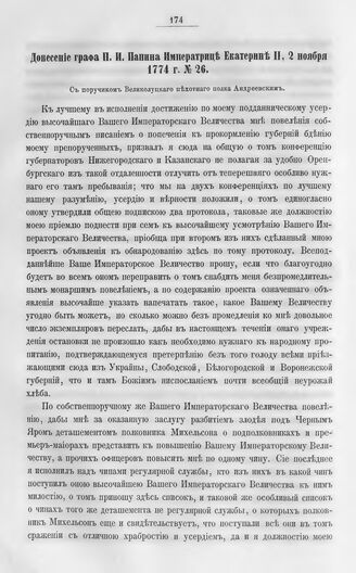 Бумаги графа Петра Ивановича Панина о пугачевском бунте. Донесение графа П.И. Панина Императрице Екатерине II, 2 ноября 1774 г. № 26