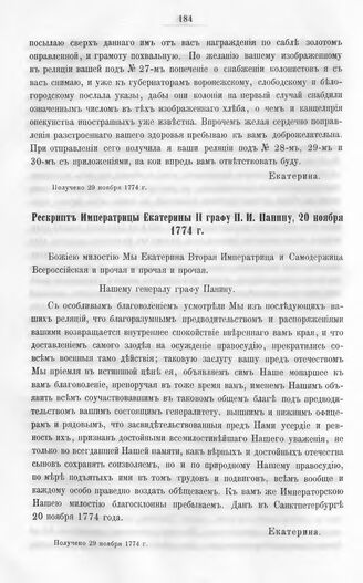 Бумаги графа Петра Ивановича Панина о пугачевском бунте. Рескрипт Императрицы Екатерины II графу П.И. Панину, 20 ноября 1774 г.