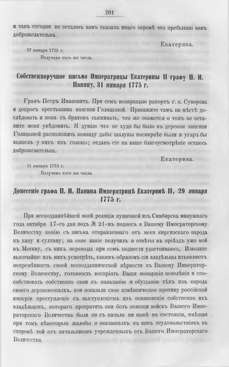Бумаги графа Петра Ивановича Панина о пугачевском бунте. Донесение графа П.И. Панина Императрице Екатерине II, 29 января 1775 г.