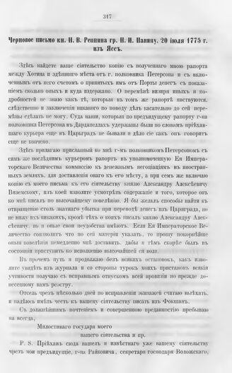 Черновое письмо кн. Н.В. Репнина гр. Н.И. Панину. 20 июля 1775 г. из Ясс [1]