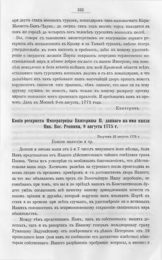 Копия рескрипта Императрицы Екатерины II, данного на имя князя Ник. Вас. Репнина, 9 августа 1775 г.