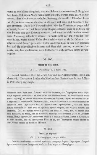 Дипломатические документы, относящиеся к истории России в XVIII столетии. Том III. Январь-июнь 1742 года. № 690. Пецольд королю. (№ 11). С.-Петербург, 6 марта 1742 г. // Саксонский государственный архив в Дрездене.