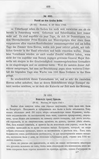 Дипломатические документы, относящиеся к истории России в XVIII столетии. Том III. Январь-июнь 1742 года. № 691. Пецольд графу Брюлю. (№ 52). Москва, 29 марта 1742 г. // Саксонский государственный архив в Дрездене.