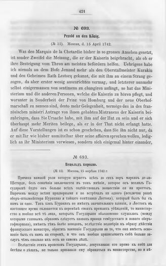 Дипломатические документы, относящиеся к истории России в XVIII столетии. Том III. Январь-июнь 1742 года. № 693. Пецольд королю. (№ 15). Москва, 15 апреля 1742 г. // Саксонский государственный архив в Дрездене.