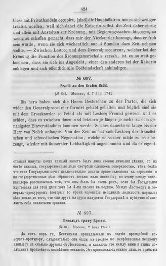 Дипломатические документы, относящиеся к истории России в XVIII столетии. Том III. Январь-июнь 1742 года. № 697. Пецольд графу Брюлю. (№ 64). Москва, 7 июня 1742 г. // Саксонский государственный архив в Дрездене.