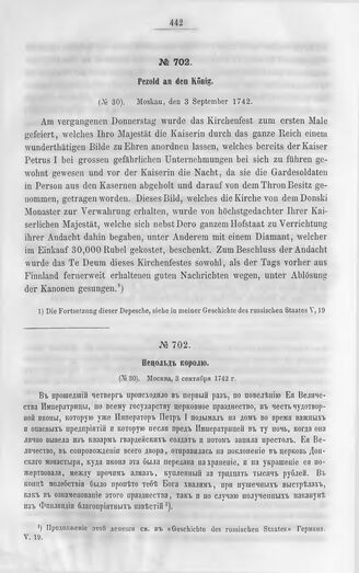 Дипломатические документы, относящиеся к истории России в XVIII столетии. Том IV. Июль-декабрь 1742 г. № 702. Пецольд королю. (№ 30). Москва, 3 сентября 1742 г. // Саксонский государственный архив в Дрездене.