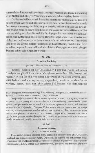 Дипломатические документы, относящиеся к истории России в XVIII столетии. Том IV. Июль-декабрь 1742 г. № 709. Пецольд королю. (№ 41). Москва, 16 ноября 1742 г. // Саксонский государственный архив в Дрездене.