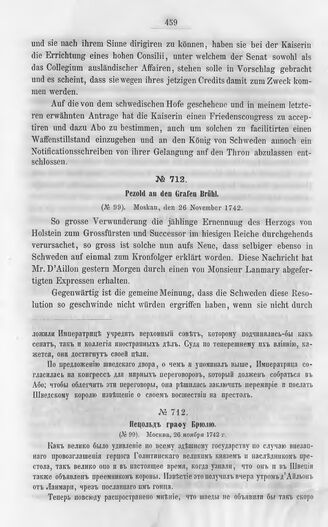 Дипломатические документы, относящиеся к истории России в XVIII столетии. Том IV. Июль-декабрь 1742 г. № 712. Пецольд графу Брюлю. (№ 99). Москва, 26 ноября 1742 г. // Саксонский государственный архив в Дрездене.