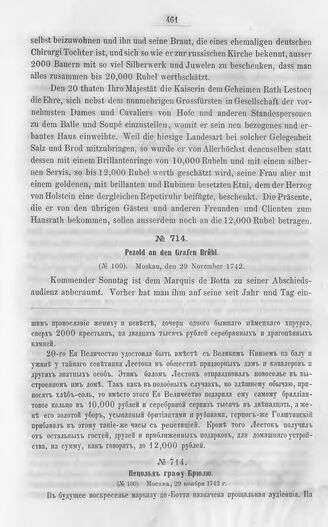 Дипломатические документы, относящиеся к истории России в XVIII столетии. Том IV. Июль-декабрь 1742 г. № 714. Пецольд графу Брюлю. (№ 100). Москва, 29 ноября 1742 г. // Саксонский государственный архив в Дрездене.