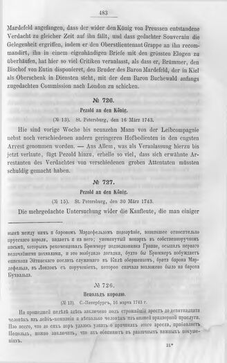 Дипломатические документы, относящиеся к истории России в XVIII столетии. Том V. Январь-апрель 1743 г. № 727. Пецольд королю. (№ 15). С.-Петербург, 30 марта 1743 г. // Саксонский государственный архив в Дрездене.