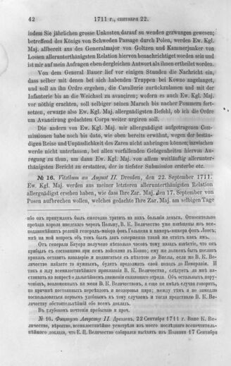 Дела с Москвою, относительно польско-шведской войны; переговоры, веденные через главного сокольничего графа Фицтума о действиях в Померании и при царском дворе. Фицтум Августу II. Дрезден, 22 сентября 1711 г.