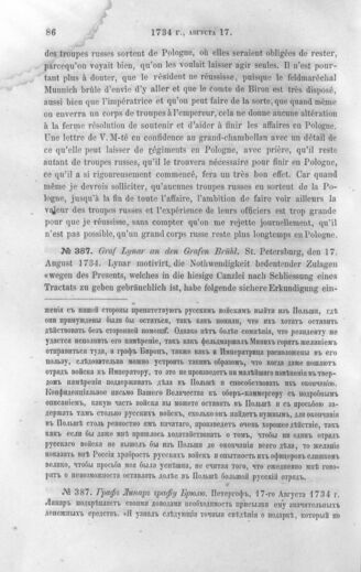 Дипломатические документы, относящиеся к истории России в XVIII столетии. Граф Линар графу Брюлю. Петергоф, 17-го Августа 1734 г.