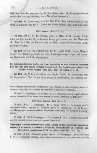 Дипломатические документы, относящиеся к истории России в XVIII столетии. Переговоры генерал-почтмейстера графа Линара с Императорским русским двором. 1735 года, Январь—Май. С.-Петербург, 14-го Мая 1735 г.