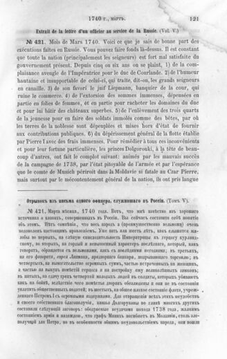 Дипломатические документы, относящиеся к истории России в XVIII столетии. Отрывок из письма одного офицера, служившего в России. Март, 1740 г. // Сборник Имп. Русс. Ист. Общества, том III, стр. 317—581 и том V, стр. 295—479.