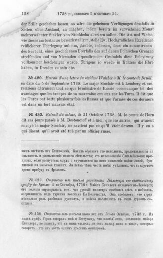 Дипломатические документы, относящиеся к истории России в XVIII столетии. Отрывок из письма резидента Вальтера его сиятельству графу де-Брюлю от 31-го Октября, 1738 г.