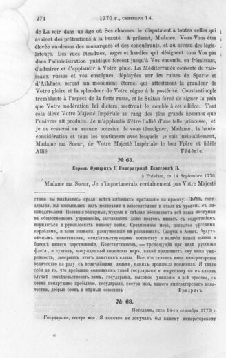 Король Фридрих II Императрице Екатерине II. Потсдам, 14 сентября 1770 г.