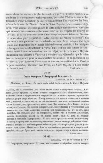 Король Фридрих II Императрице Екатерине II. Потсдам, 28 октября 1770 г.