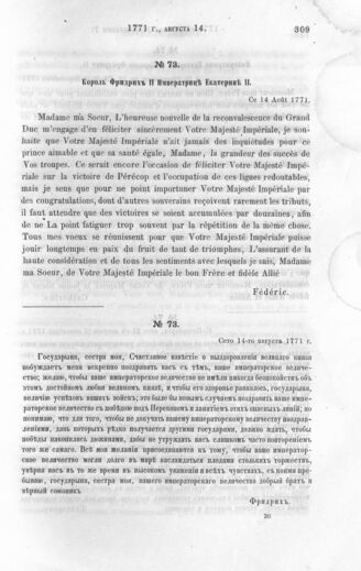 Король Фридрих II Императрице Екатерине II. 14 августа 1771 г.