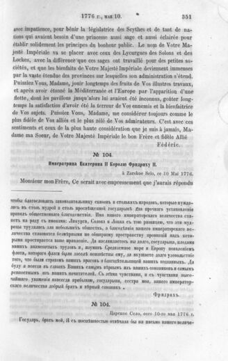 Императрица Екатерина II Королю Фридриху II. Царское Село, 10 мая 1776 г.