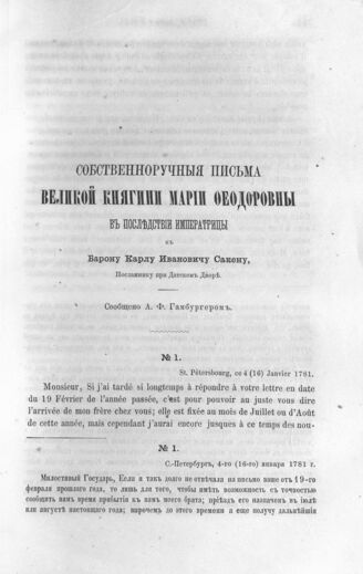 Собственноручные письма Великой Княгини Марии Федоровны в последствии императрицы к Барону Карлу Ивановичу Сакену, посланнику при Датском Дворе. С.-Петербург, 4-го (16-го) января 1781 г.