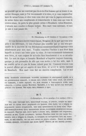 Собственноручные письма Великой Княгини Марии Федоровны в последствии императрицы к Барону Карлу Ивановичу Сакену, посланнику при Датском Дворе. С.-Петербург, 27-го октября (7-го ноября) 1783 г.