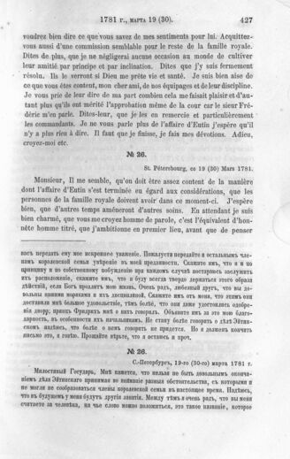 Письма Великого Князя Павла Петровича в последствии Императора Павла I к Барону Карлу Ивановичу Сакену, Посланнику при Датском дворе. С.-Петербург, 19-го (30-го) марта 1781 г.