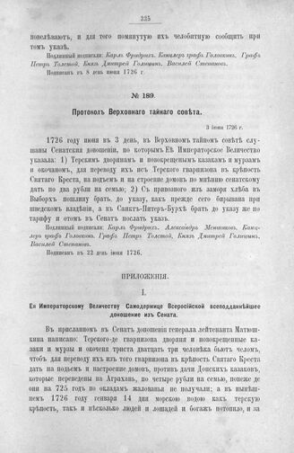 Приложение к протоколу Верховного тайного совета от 3 июня 1726 г. Ее Императорскому Величеству Самодержице Всероссийской всеподданнейшее доношение из Сената. 13 мая 1726 г. [1]