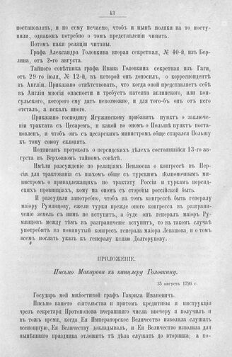Приложение к журналу Верховного тайного совета от 15 августа 1726 г. Письмо Макарова к канцлеру графу Головкину. Петергоф, 15 августа 1726 г.