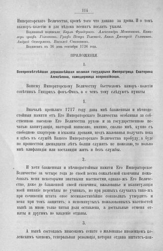 Приложение к протоколу Верховного тайного совета от 26 сентября 1726 г. Всеподданнейшее прошение советника камер-коллегии Генриха фон-Фика. Июль 1726 г.