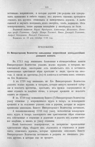 Приложение к протоколу Верховного тайного совета от 28 сентября 1726 г. Ее Императорскому Величеству Самодержице Всероссийской всеподданнейшее доношение из Сената. 12 августа 1726 г.