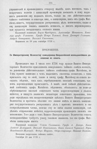 Приложение к протоколу Верховного тайного совета от 28 сентября 1726 г. Ее Императорскому Величеству Самодержице Всероссийской всеподданнейшее доношение из Сената. 21 сентября 1726 г. [3]
