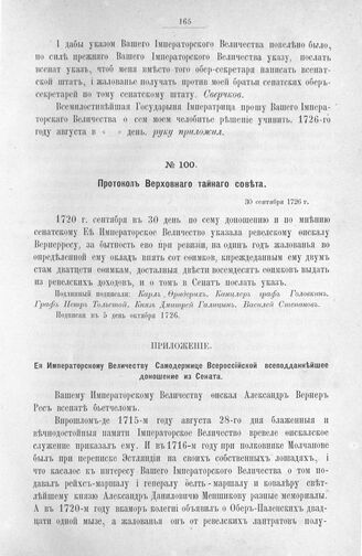 Приложение к протоколу Верховного тайного совета от 30 сентября 1726 г. Ее Императорскому Величеству Самодержице Всероссийской всеподданнейшее доношение из Сената. 24 августа 1726 г.
