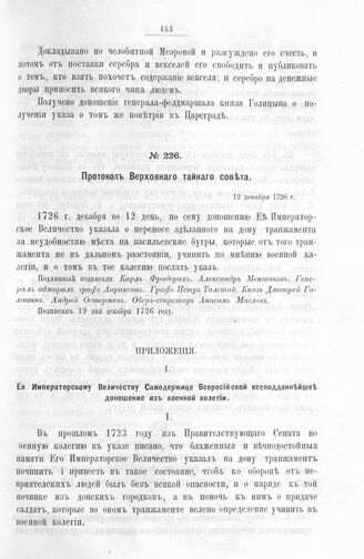 Приложение к протоколу Верховного тайного совета от 12 декабря 1726 г. Ее Императорскому Величеству Самодержице Всероссийской всеподданнейшее доношение из военной коллегии. 12 декабря 1726 г.