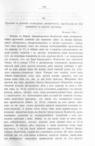 Приложение к протоколу Верховного тайного совета от 14 декабря 1726 г. Перевод с реляции коммисаров лифлянских, определенных для принятия в Швеции архивов. 26 ноября 1726 г.