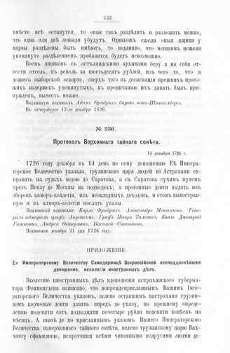 Приложение к протоколу Верховного тайного совета от 14 декабря 1726 г. Ее Императорскому Величеству Самодержице Всероссийской всеподданнейшее доношение из коллегии иностранных дел. 11 декабря 1726 г.